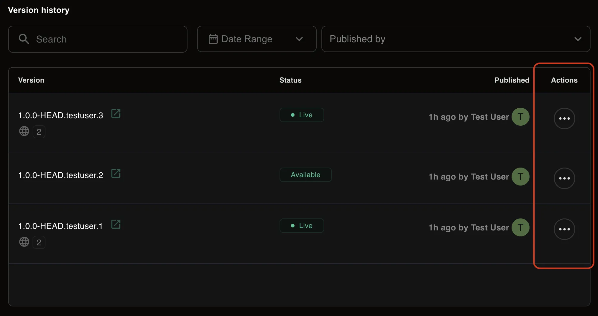 The Version Status feature allows you to track and manage different versions of your application. You can mark a version as Available, Deprecated, Unavailable, Failed, Rolled back, Live.